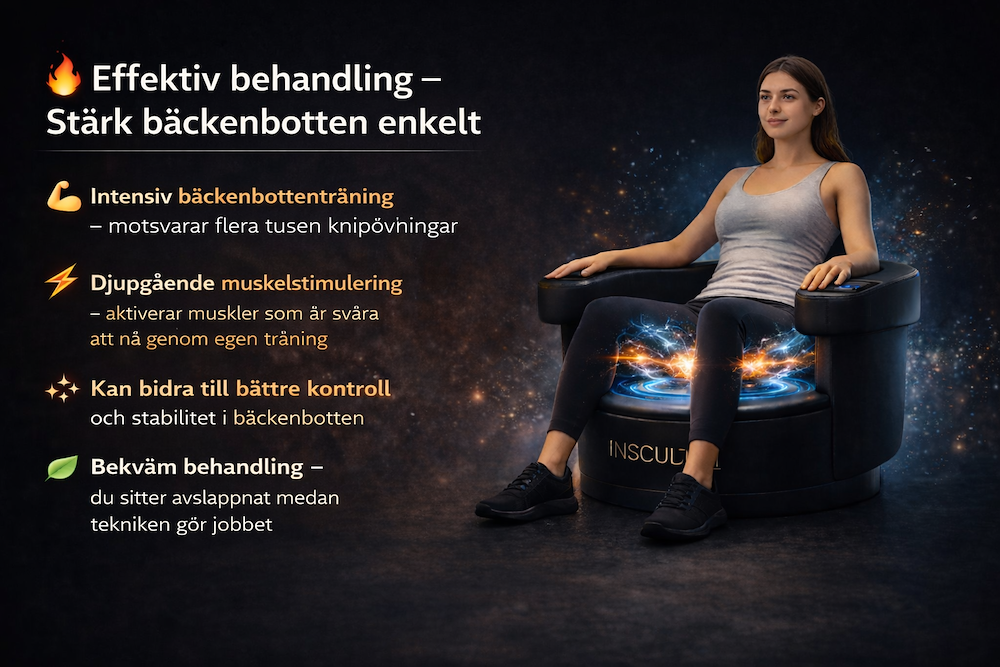 Insculpt Chair är en modern och bekväm behandling som använder avancerad elektromagnetisk teknik för att aktivera och stärka bäckenbotten och sätesmusklerna. Under behandlingen sitter du fullt påklädd i stolen medan musklerna tränas genom kraftfulla, djupa muskelkontraktioner.